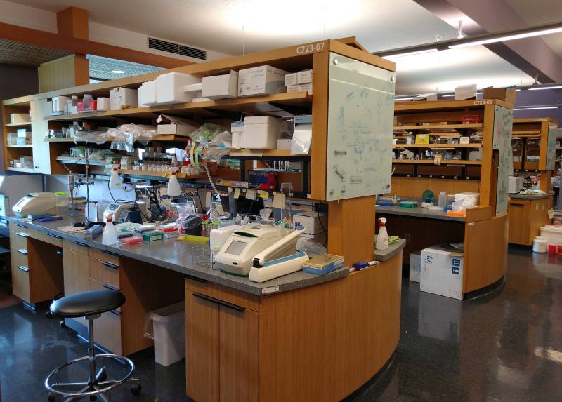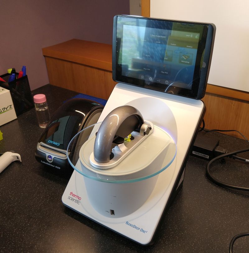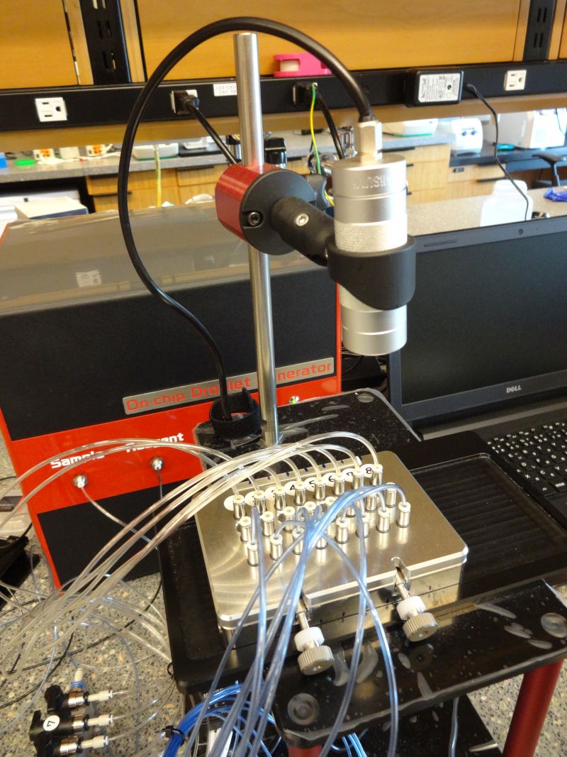 Droplet generator from On-chip Biotechnologies is used to generate water-in-oil emulsion droplets for microfluidics work.